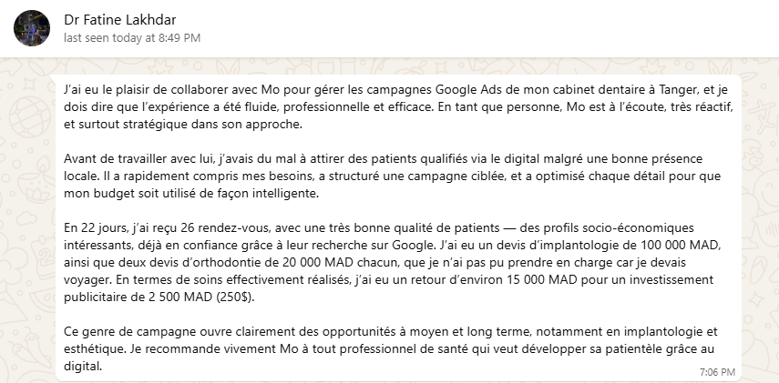 Dr Fatine est une jeune chirurgienne-dentiste reconnue pour sa compassion et son attention envers ses patients.